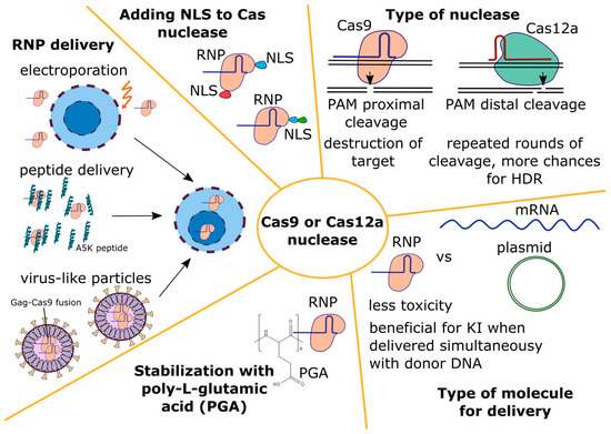 The order in which CRISPR/Cas components are added can also be important. Roth et al. showed that the highest levels of knock-in can be achieved by first mixing RNP and donor DNA and then adding them to cells. However, this procedure causes maximum toxicity [27].
