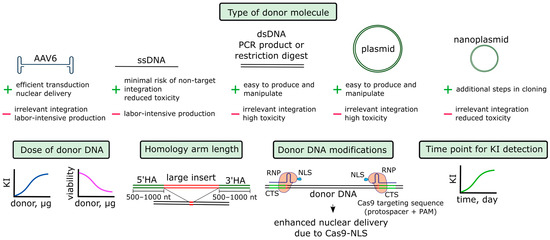 It has been noted that an increase in the dose of donor DNA leads to an increase in the level of knock-in, whereas the amount of Cas protein does not play a major role and can be reduced. However, in this case, toxicity increases sharply [49,54,130]. As a result, it is necessary to select the optimal dose to achieve the maximum knock-in level while maintaining cell viability.