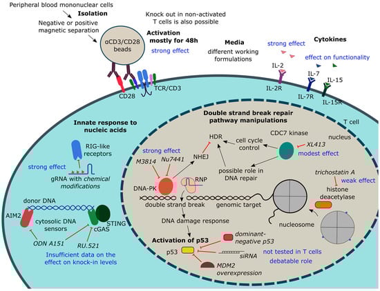 There have been studies of various factors affecting the editing efficiency of primary human cells, in particular T cells, using CRISPR/Cas-mediated knock-in. These factors can be divided into two main groups: (1) the composition and delivery mode of CRISPR/Cas components, and (2) the state of cells that should be amenable to editing. All factors discussed below are indicated in Table 1.