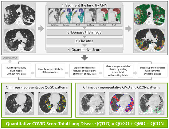 Standardized non-contrast volumetric chest high-resolution computed tomography (HRCT) was performed with 3-mm slice thickness with equipment from 4 manufacturers (Siemens from München, Germany, GE from Boston, USA, Philips from Amsterdam, Netherlands, Toshiba from Tokyo, Japan). Baseline (the initial scan on hospitalization) and longitudinal follow-up HRCT scans were obtained, where the median (±IQR) follow-up duration from baseline was 8 (±5) days, 20 (±26) days, 51 (±21) days, and 60 (±36) days for 44% (97/218), 24% (53/218), 13% (29/218), and 5% (10/218), respectively, of the present study cohort. All scans were anonymized and digitally transferred for quantitative analyses. Quantitative HRCT analyses were performed by the Center for Computer Vision and Imaging Biomarkers (CVIB) at the Department of Radiological Science at the University of California Los Angeles (UCLA) (Computer Aided Analyses for CT Images, IRB No. 11-0000126 at UCLA). We developed the quantitative COVID scores from the HRCT images (Figure 1) using semi-supervised learning from the previous interstitial lung disease model. The adaption steps were to: (1) run the technique developed for interstitial lung disease [27,28] to infectious diseases [29], (2) identify misclassified regions of interest (ROI) in the infectious disease cohort, (3) explore the characteristics of misclassified ROIs, (4) make a simple adjustment for a new class, and (5) adapt this model by adding a new class of consolidation and expand GGO patterns. The final model to calculate the quantitative COVID scores was reviewed and confirmed the visualization of the classification result using an independent COVID-19 cohort at UCLA by thoracic radiologists (Jonathan G. Goldin and Fereidoun Abtin) [30]. High-throughput computation for COVID was performed using the pipeline of automated imaging import, labeling of the inspirational scans, and deep learning-based lobar segmentation [31]. Briefly, four steps of high-throughput are: (1) HRCT images are segmented by convolutional neural networks (CNN) after automatic labeling inspirational series using DICOM information [31]; (2) denoise HRCT images in order to normalize the different inherent noise [32]; (3) run adapted classifier model for COVID-19 using the denoised radiomic features and support vector machine [27]; (4) generate a score in ratio where the numerator is the number of classified voxels for a subtype and the denominator is the total number of voxels. For example, QGGO is a ratio where the numerator is the count of voxels that were classified as GGO patterns. In HRCT images from the COVID population, ground glass opacities usually represent acute inflammatory processes; mixed diseases represent heterogeneous opacity with areas of reticulation, with and without architectural distortion; and consolidation is frequently associated with pulmonary infection [33]. Quantitative COVID-19 Image (QCOVID) scores were composed of four distinct radiological patterns on HRCT: (1) quantitative ground-glass opacity (QGGO, yellow and cyan dots), (2) mixed diseases (QMD, red and blue dots), (3) consolidation (QCON, mint dots), and (4) normal lung (QNL). The sum of the three abnormal lung tissue scores was named the quantitative total lung disease (QTLD).