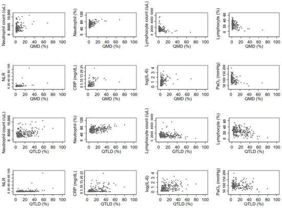 The QGGO, QMD, QCON, and QTLD scores showed a positive correlation with neutrophil count, and QMD, QCON, and QTLD scores showed a negative correlation with lymphocyte count. All four QCT COVID scores showed a significant positive correlation with NLR, CRP, and IL-6 levels (Table 2). Among those, the correlation coefficients of QMD score, CRP, and IL-6 were relatively higher (rho = 0.5669 and 0.4908, respectively) than the correlation coefficients of other parameters. Figure 2 displays the associations between QCT COVID scores (QMD and QTLD) and laboratory measurements of neutrophils, lymphocytes, NLR, CRP, IL-6, and PaO2 at baseline. Both the QMD score and QTLD score showed positive correlations with neutrophil count, neutrophil percentage, NLR, CRP, and IL-6. In contrast, both scores exhibited negative correlation with lymphocyte count, lymphocyte percentage, and PaO2. There are a few outliers shown in Figure 2. These outliers indicate that some patients with severe infections have extremely high levels of CRP and neutrophil count.