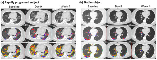 The mean (±SD) duration between two HRCT images was 9.5 days ± 5.7 (n = 82), where the maximum duration was 32 days after the initial scan with available PCR results. Changes in QMD scores were associated with age, the status of rapid progressors, CRP, and QMD at baseline (R2 = 0.66, n = 82) (Table 5). The overall mean (±SD) reduction was 84% (±0.084) of the QMD score at baseline (p < 0.0001), although the rapidly progressing subjects increased the QMD score by 4.9% (p = 0.019) compared with the QMD score of the stable (non-rapid progressor) subjects. Older age groups are more likely to increase QMD scores by 0.126, with one unit of increased age in years. At follow-up, CRP was associated with changes in QMD with a mean (±SD) of 0.20 (0.13) (p = 0.003). There were 60 subjects within ten days of follow-up CT imaging. These results were mostly consistent with those of the overall subjects. A minor difference was observed in the rapidly progressing subjects, with an increased mean QMD score of 4.6% (p = 0.071) compared with the QMD score of the stable subjects. Figure 3 shows a representative longitudinal CT imaging in a rapidly progressive subject and a stable subject.