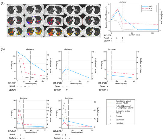 Twenty-one patients had longitudinal CT images taken more than two months after the initial diagnosis and hospitalization. CT scans were performed at least twice and up to six times per patient. The final CT scan was performed after discharge. In all patients, lung lesions were still observed with a QTLD of 1.4–29.3% on CT after two months or more. Figure 4a shows the CT image changes in a 58-year-old man. After the COVID-19 diagnosis, a chest CT was performed five times serially from baseline, and the last CT scan was performed 113 days after diagnosis. Chest CT performed at the first hospitalization showed QMD of 12.5%, QGGO of 27%, and QTLD of 39.8%. On the second CT taken after 16 days, the QMD was 22.8%, QGGO was 23.2%, and QTLD was 47%. On the third CT taken after 26 days, the QMD was 14.5%, QGGO was 23.1%, and QTLD was 37.7%. When the patient was discharged, nasal RT-PCR showed an equivocal state, undergoing negative conversion. The fourth CT, after 64 days, showed a QMD score of 1.1% and QGGO of 7.5%. On the fifth CT taken after 113 days, the QMD was 1.4%, QGGO 8.1%, and QTLD 9.7%, mainly GGO lesions remained. The QMD score, CRP level, NLR changes, and RT-PCR results of the other five patients who had longitudinal CT images are shown in Figure 4b. On follow-up CT at three months, the QMD score remained high at 0.5–9.1%, and QGGO remained at 2–19%. In particular, lung lesions remained on CT for several weeks after negative results on real-time RT-PCR assay of SARS-CoV-2 for nasal and pharyngeal swab specimens.