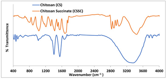 The chitosan and CSSC polymers were investigated by employing infrared spectroscopy. Each sample was compressed into discs using potassium bromide (KBr). Each disc was scanned in the range of 4000 cm−1 to 400 cm−1 using a Thermo Scientific Nicolet IR 200 spectrometer (Thermo Scientific, Waltham, MA, USA) [27].