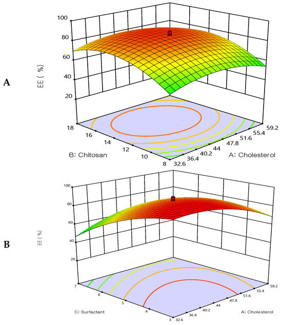 The response surface methodology linked with the effectiveness of drug entrapment showed that increasing the concentrations of cholesterol and chitosan led to an improvement in the EE% (Figure 2). The concentration of cholesterol has a linear relationship with entrapment efficiency, cholesterol is found to improve membrane fluidity thereby enhancing the distribution of aqueous phase within the liposomal vesicles. Due to chitosan adhering to the outermost layer of the liposomes, which increased the drug’s holding power, the prepared formulations had a considerably improved EE%. These findings are in agreement with earlier studies [36,37], which revealed that when the chitosan concentration was increased, there was no longer any drug leakage since the equilibrium of chitosan adsorption to the liposome surface had been reached. The entrapment efficiency was decreased by increasing Tween 80. These results may be due to Tween 80 being composed of a chain of unsaturated alkyls. The presence of double bonds caused the chains to bend, resulting in the creation of an inadequately tight liposomal membrane. Therefore, the membrane of the liposomes was more permeable, which may account for the reduced entrapment efficiency of the Tween 80 formulations. Additionally, a report has indicated that the entrapment efficiency was increased by increasing the cholesterol content.