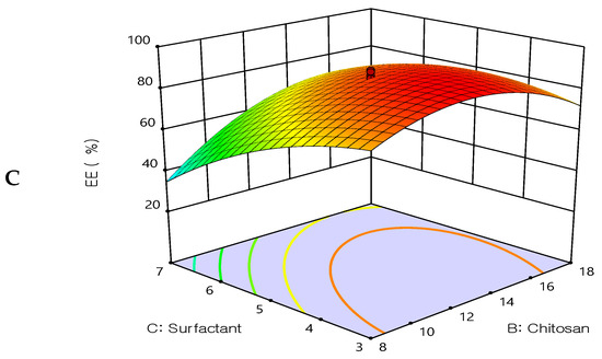 Figure 2. Three-dimensional surface plot for the influence of the independent variables on Entrapment Efficiency. (A) Effect of cholesterol and chitosan on EE%, (B) Effect of cholesterol and surfactant on EE%, (C) Effect of chitosan and surfactant on EE%.