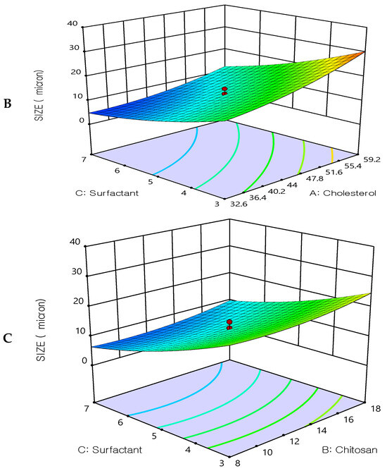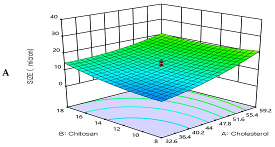 The optimization study’s objective aimed to minimize the size of the prepared 5FU-chitosomes. Three-dimensional response surface plots serve as evidence that the impacts caused by the independent variables with the size were investigated (Figure 3). The 5FU-chitosomes containing Tween 80 were found to be in smaller particle size which may be due to the reduction in surface tension, resulting in phospholipid uniform arrangement in small vesicles [32]. Increasing the concentration of cholesterol resulted in increases in the particle size. An increase in chitosan content resulted in increased particle size whereas, above a certain concentration, rearrangement of the lipid bilayer led to the formation of small particle-sized vesicles. A smaller particle size was found because complete liposome coating/restabilization is guaranteed by a great chitosan polymer content in conjunction with ideal coating process conditions. However, there are situations when a discernible rise in size is seen after coating with a relatively small amount of chitosan solution, which can be explained by the aggregation of two or more vesicles that are tightly packed together [38,39]. The polydispersity index for all prepared 5FU-chotosomes was less than 0.5 which indicates the homogeneity of size distribution. The quadratic polynomial equations expressed the effect of formulation factors in particle size:
