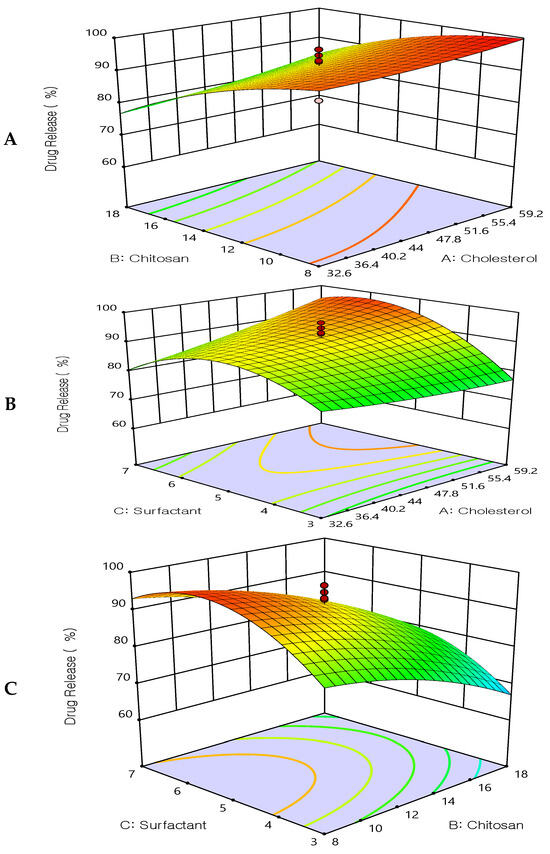 Figure 4. Three-dimensional surface plot for the influence of the independent variables on Drug Release. (A) Effect of cholesterol and chitosan on drug release %, (B) Effect of cholesterol and surfactant on drug release %, (C) Effect of chitosan and surfactant on drug release %.