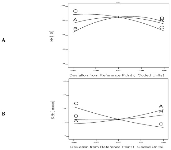 A quadratic model that relates the responses and the independent variables was chosen by the central composite design and described in terms of the coded parameters by the second-order polynomial equations. The updated model’s multiple correlation coefficient (R2) and confidence interval (P) were used to evaluate it. As represented in Table 3, the equations of (EE), (size), and DR all had R2 values of 0.9707, 0.9690, and 0.9718, respectively. A good fit model is defined as an R2 value of more than 0.80, implying that the applied regression model is adequate [40]. This implies that the process parameters investigated explain more than 98% of the variability in chitosome characteristics and that the model could not explain only 2% of the variation in response [41].