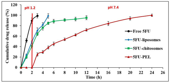 It was found that AUC0−∞ for 5FU-liposomes, 5FU-chitosomes, and 5FU-PEL were 3.819 ± 0.65, 8.543 ± 1.02, and 12.763 ± 1.78 ng·h/mL, respectively. The relative bioavailability % of 5FU-chitosomes and 5FU-PEL were 223.69 ± 3.82% and 334.19 ± 2.07%, respectively. These results may be due to the CSSC coat which contains -COOH groups, having the potential to chelate Ca2+ ions present in adherens junctions (AJs) and cause disruption of epithelial tight junctions (TJs) in the jejunum and ileum. When compared to 5FU-chitosomes, the synergistic actions of PEL facilitate a significant improvement in the oral bioavailability of 5FU [61].