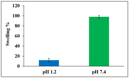 The influence of pH on the degree of swelling of 5FU-PEL is depicted in Figure 10. The swelling of PEL in 0.1N HCl and phosphate buffer saline was reported to be 12% and 98%, respectively. The findings clearly show that the swelling ability of PEL was decreased in acidic media. This could be due to carboxylic groups in the CSSC that exist in the nonionized form under acidic conditions and are poorly hydrophilic, whereas under basic conditions carboxylic groups exist in ionized form and are significantly hydrophilic [54]. As a result, 5FU encapsulated in PEL may be protected from the severe acidic environment of the stomach. The swelling of the PEL eventually increased to pH 7.4 after 6 h due to a rise in polymer swellability in basic pH, resulting in the relaxation of the polymeric network. In an alkaline medium, the PEL was expected to inflate upon liquid uptake and produce a hydrated, viscous layer surrounding the liposomes. The polymer inflated as a result of liquid entry into the vesicles, resulting in the creation of a rate-controlling membrane. CSSC, a hydrophilic polymer found in the chitosome’s outermost layer, is responsible for increased hydrophilicity. This suggests that CSSC may be efficiently attached to chitosomes.