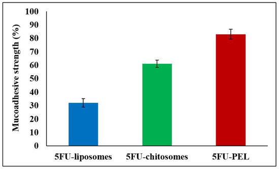 Figure 11. Mucoadhesive strength of 5FU-liposomes, 5FU-chitosomes, and 5FU-PEL formulations.