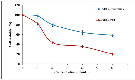 In HT-29 cells, the antiproliferative effects of 5FU-liposomes and 5FU-PEL were examined over 24 h at concentrations of 10, 20, 40, and 60 μg/mL. Figure 12, shows the cell viability of colon cancer cells treated with 5FU-PEL and conventional 5FU-liposomes. Results from the MTT experiment indicated that PEL treatment of the HT-29 cells resulted in significantly lower cell viability (p < 0.05) as compared to treatment with conventional liposomes. The findings suggested that the PEL increases the permeability of 5FU, offering maximum drug exposure to the cancerous cells and, as a result, significantly inhibits colon cancer cell proliferation. Interestingly, the pharmacological action of 5FU is diminished relatively quickly after absorption due to its short half-life [60]. Our results suggest that 5FU-PEL allows it to adhere to the cell’s surface first before achieving sustained drug release at the colon pH region and then enhanced membrane permeability, providing a potential PEL to improve its anticancer efficacy.