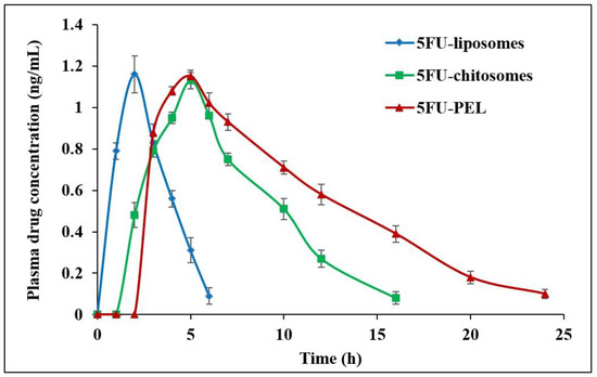 Figure 13. In vivo plasma drug concentration after administration of 5FU-liposomes, 5FU-chitosomes, and 5FU-PEL formulations.