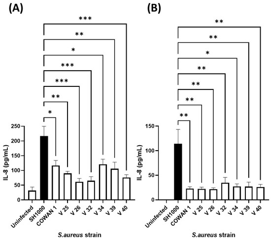 Selection of IL-8-inducing S. aureus strain. Human HaCaT skin (A) and A549 lung (B) epithelial cells were stimulated with eight strains of S. aureus for six hours. Supernatants were collected and the concentration of IL-8 determined by ELISA. Results are expressed as the mean ± SEM of 4 experiments (n = 4). Differences between treatments were calculated using an ANOVA multiple comparison test with a Tukey’s post hoc test with * p < 0.05, ** p < 0.01, *** p < 0.001, levels considered significantly different. Black bar shows S. aureus SH1000 response.