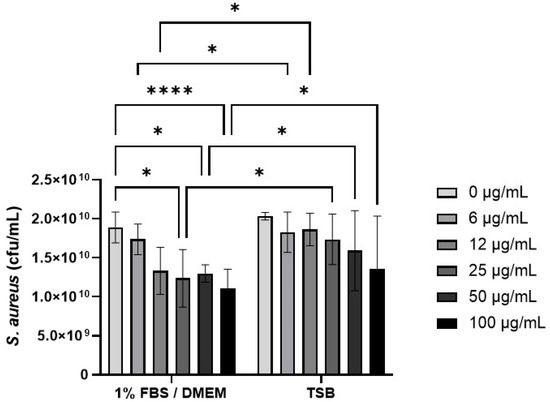 The effect of CB (0–100 µg/mL) on S. aureus SH1000 growth was investigated in 1% FBS/DMEM and in the staphylococcal growth media, TSB (Figure 4). Preliminary experiments confirmed that concentrations of CB above 10 µg/mL had significant absorbance (OD600) that interfered with S. aureus growth assays (Supplementary Figure S1) and thus colony growth assays were used (Figure 4). In 1% FBS/DMEM, CB (0–100 µg/mL) caused a dose-dependent decrease in the growth of S. aureus SH1000 as measured by colony forming units (left hand side, Figure 4). This reached significance at 25 µg/mL (compared to untreated control). In contrast, CB had very little effect on the growth of S. aureus SH1000 when grown in TSB; no significant differences were observed compared to untreated control (right hand side, Figure 4). Furthermore, CB at 6–100 µg/mL significantly reduced growth in 1%FBS/DMEM compared to equivalent does in TSB. Growth of S. aureus in 1% FBS/DMEM and TSB was equal.