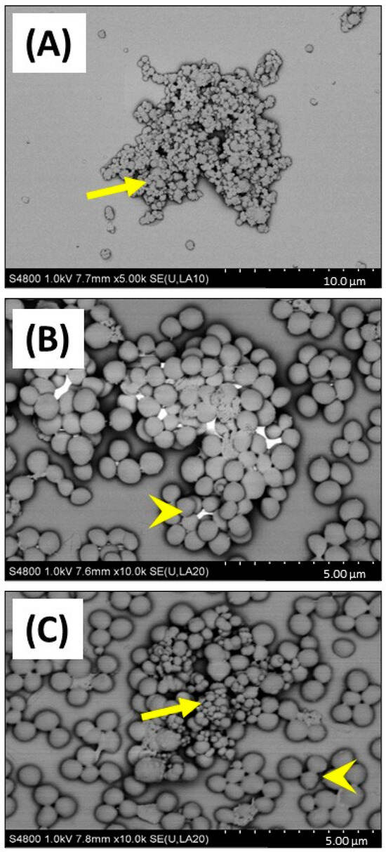 SEM imaging of carbon black and S. aureus SH1000. SEM was used to investigate carbon black (AROSPERSE® 15) and S. aureus interactions, aggregation, and binding. (A) CB (25 µg/mL) alone, (B) S. aureus SH1000 alone, (C) CB (25 µg/mL) and S. aureus SH1000. Yellow arrows show carbon black particles. Yellow arrowheads show S. aureus SH1000 bacteria. Size scale shown in bottom right of each panel. Images were generated with a Hitachi S4800 microscope with original magnification ×10,000.