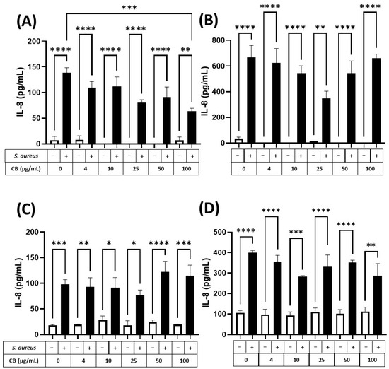 In comparison, A549 lung epithelial cells (Figure 6C,D) showed a significant increase in IL-8 production in response to S. aureus SH1000 at 5 h, compared to uninfected control (Figure 6C, left white bar). By 24 h, IL-8 was significantly enhanced in response to S. aureus SH1000 (Figure 6D). Indeed, at 5 and 24 h, S. aureus SH1000-induced IL-8 production in lung epithelial cells (Figure 6C,D, black bars) was unaffected by CB over the concentration range studied with consistent significant increases compared to uninfected control at each dose of CB (Figure 6C,D). In the same supernatants, IL-6 and IL-10 were also measured by ELISA. IL-6 production was low, and no differences were detected between treatments (Supplementary Figure S5) although S. aureus SH1000 induced IL-6 at 24 h independently of CB dose (Supplementary Figure S5B). IL-10 was undetectable in all cases.