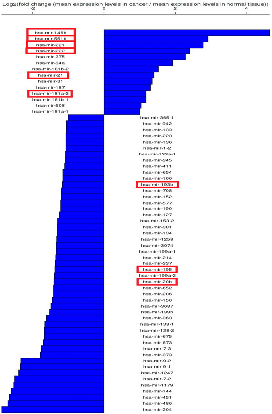 Graphical representation of top altered miRNA transcripts in TC, generated using the online portal TCOA (the red box presents the miRNAs selected for analysis).