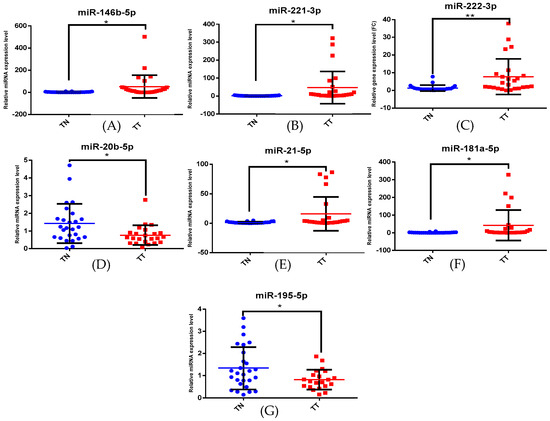 miRNA expression for (A) miR-146b-5p, (B) miR-221-3p, (C) miR-222-3p, (D) miR-20b-5p, (E) miR-21-5p, (F) miR-181a-5p and (G) miR-195-5p in cPTC patients. TT = tumour tissue; TN = normal tissue (* p < 0.05, ** p < 0.005).