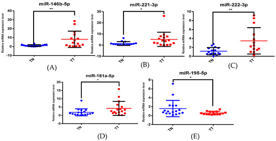 miRNA expression for (A) miR-146b-5p, (B) miR-221-3p, (C) miR-222-3p, (D) miR-181a-5p and (E) miR-195-5p in iFVPTC patients. TT = tumour tissue; TN = normal tissue (* p < 0.05, ** p < 0.005).