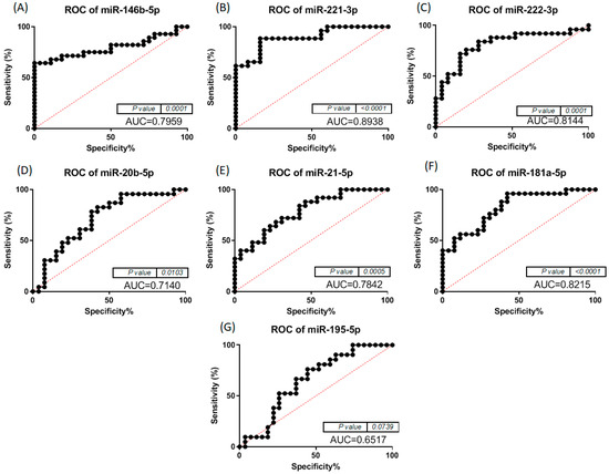 ROC curves for (A) miR-146b-5p, (B) miR-221-3p, (C) miR-222-3p, (D) miR-20b-5p, (E) miR-21-5p, (F) miR-181a-5p and (G) miR-195-5p in cPTC group.