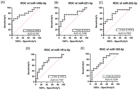 ROC curves for (A) miR-146b-5p, (B) miR-221-3p, (C) miR-222-3p, (D) miR-181a-5p and (E) miR-195-5p in iFVPTC group.