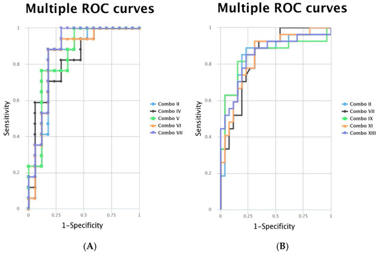 ROC curves for combinations of the tested miRNAs in (A) iFVPTC patients and (B) cPTC patients. Combinations of the selected miRNAs (presented in colours) are detailed in Table 2.