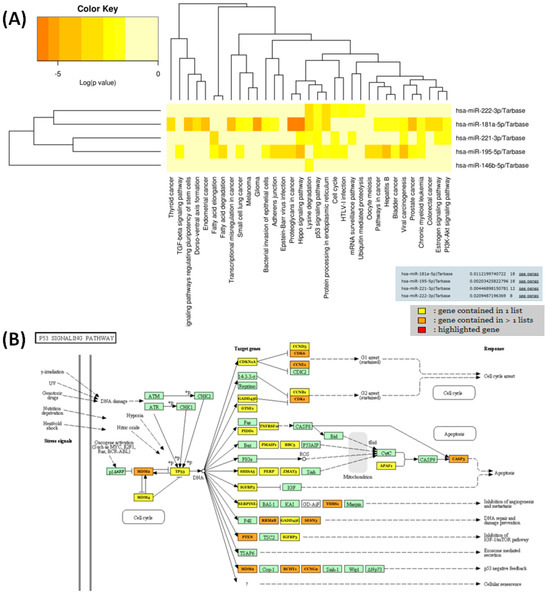 (A) Heatmaps were generated to visualise the notable pathways identified as significant by DIANA-miRPath (v.3.0) for the shared to common miRNA signature for the two subtypes of PTC. These heatmaps utilised clustering to arrange the pathways based on their significantly levels, with paths displayed along the x-axis and miRNAs along the y-axis. A colour code was applied to indicate the logarithmic (log) values of p-values. The most relevant interactions between predicted miRNAs and pathways were highlighted in red, (B) a graphical representation of the main target related to TP53 signalling for the selected miRNA panel.