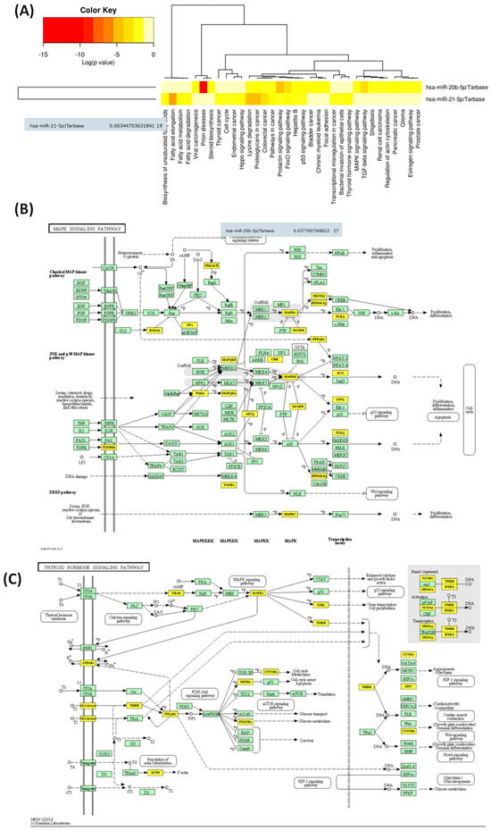 (A) Heatmaps were generated to visualise the notable pathways identified as significant by DIANA-miRPath (v.3.0) for the specific miRNA signature for cPTC. These heatmaps utilised clustering to arrange the pathways based on their significance levels, with paths displayed along the x-axis and miRNAs along the y-axis. A colour code was applied to indicate the logarithmic (log) values of p-values. The most relevant interactions between predicted miRNAs and pathways were highlighted in red, (B) a graphical representation of the main target related to MAPK signalling and (C) a Thyroid hormone signalling pathway for the selected miRNA panel.