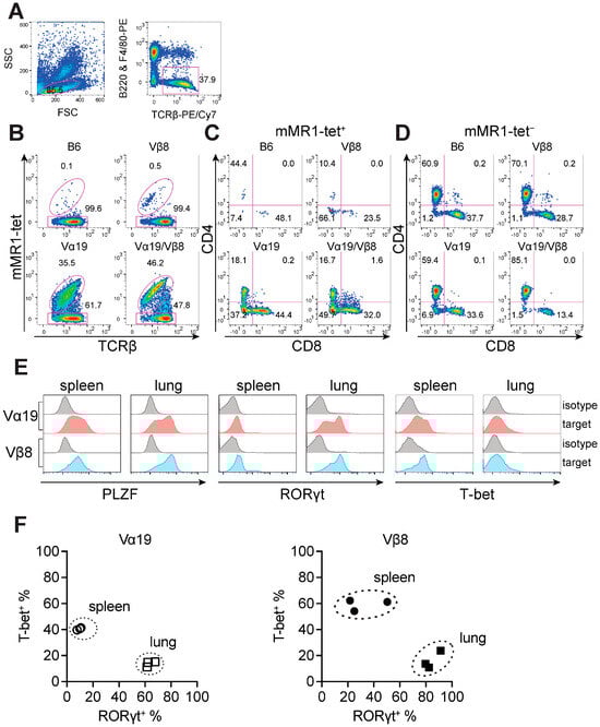 PLZF, RORγt, and T-bet are pivotal transcription factors in MAIT cell development and function [,,]. Thus, their expression in MAIT cells from the spleen and lungs of Vα19 and Vβ8 mice was examined. PLZF was detected in the majority of spleen and lung MAIT cells for both Vα19 and Vβ8 mice (Figure 1E). RORγt was also detected in MAIT cells from both groups of mice. However, lung MAIT cells exhibited higher expression than spleen MAIT cells (Figure 1E). MAIT cells are composed of the MAIT1 and MAIT17 subsets; however, their distribution varies from one tissue to another in C57BL/6 []. MAIT17 is characterized by RORγt expression, whereas MAIT1 is characterized by T-bet expression. The relative abundance of MAIT1 and MAIT17 was then evaluated in these mice. In both Vα19 and Vβ8 mouse lung MAIT cells, RORγt-expressing cells (MAIT17) were dominant over T-bet-expressing cells (MAIT1) (~60–80% cells were RORγt+, while less than 20% cells were T-bet+). In contrast, MAIT1 was more abundant in spleen MAIT cells (40–60% of cells were T-bet+, while less than 10% and 40% were RORγt+ in Vα19 mice and Vβ8 mice, respectively (Figure 1F)). These results agree with the previous report evaluating C57BL/6 [].