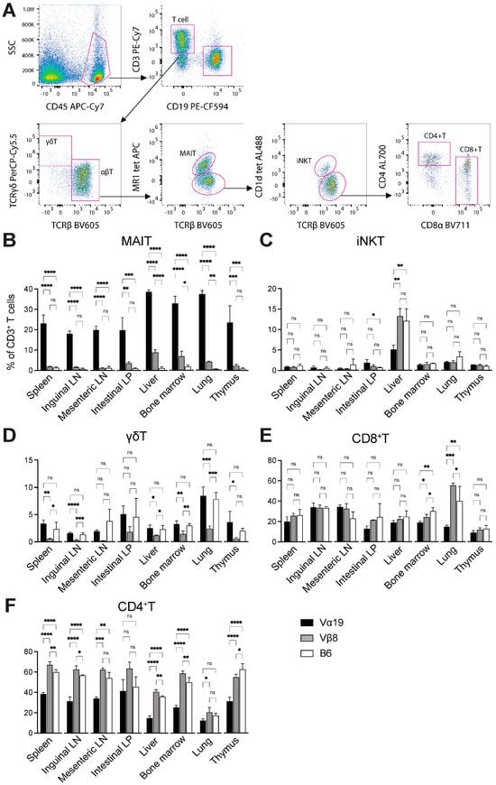 Frequency of T cell subsets in Vα19, Vβ8, and control mice. Representative gating strategy of each T cell subset (pseudcolor density plots) is shown in (A). Relative frequency of MAIT (B), iNKT (C), γδT (D), CD8+ T (E), and CD4+ T (F) cells among CD3+ T cells in the indicated organs is shown (n = 4 per strain). Bar graph depicts means ± SD. Vα19: Vα19 mice, Vβ8: Vβ8 mice, B6: C57BL/6. * p < 0.05, ** p < 0.01, *** p < 0.005, **** p < 0.0001, ns: not significant (One-way ANOVA).