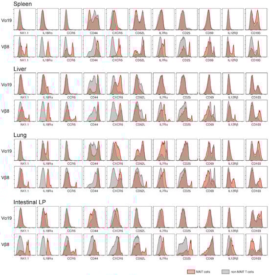 Comparative analysis of MAIT and non-MAIT T cells in the representative tissues of Vα19 and Vβ8 mice was performed based on the cell surface molecules [,]. In Vα19 mice, little difference in surface molecule expression was observed between MAIT and non-MAIT T cells for any molecules except for NK1.1 in the spleen and in the intestinal LP, while there was an increase in interleukin (IL)-18Rα and CXCR6 in the liver and in lung MAIT cells relative to non-MAIT T cells (Figure 3). In contrast, between MAIT and non-MAIT T cells of Vβ8 mice, there was a large difference in surface molecule expression levels (Figure 3). MAIT cells in Vβ8 mice expressed higher levels of the surface molecules except for CD62L, which was expressed less than non-MAIT T cells across the tissues, except for intestinal LP. CD103 showed a similar decrease in MAIT cells in intestinal LP, whilst the reverse trend was seen in the spleen, liver, and lung in Vβ8 mice (Figure 3).