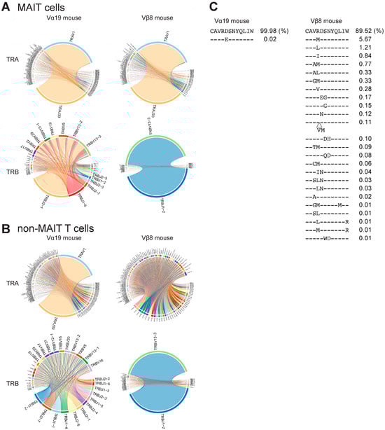 TCR repertoire analysis. (A) Circos plot for MAIT cells. Circos plots for MAIT cells in the thymocytes from the indicated mouse strain are depicted. Upper and lower panels indicate TRA and TRB, respectively. (B) Circos plot for non-MAIT T cells. Circos plots for non-MAIT T cells in the thymocytes from the indicated mouse strain are shown. Upper and lower panels indicate TRA and TRB, respectively. (C) Diversity in CDR3α. Amino acid sequences of CDR3α are aligned for MAIT cells in Vα19 mice (left panel) and those in Vβ8 mice (right panel). -; the same amino acid indicated in the first line of sequences. Δ; additional sequence insertion point. The percentage shows the frequency of the clone(s) harboring the indicated CDR3 sequence among MAIT cells.