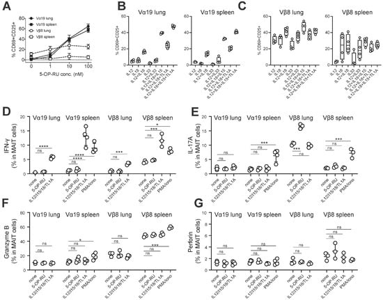 MAIT cell activation and production of IFN-γ and IL17A. (A) Activation of MAIT cells by 5-OP-RU. Percentages of CD69+CD25+ cells in MAIT cells among lung mononuclear cells and the spleen cells from the indicated mice followed by stimulation with varying amounts of 5-OP-RU (1–100 nM) are depicted (n = 4 per group). (B,C) Activation of MAIT cells by cytokines. Percentages of CD69+CD25+ cells in MAIT cells among lung mononuclear cells and the spleen cells from Vα19 mice (Β) and Vβ8 mice (C) followed by stimulation with the combination of the indicated cytokine(s) are depicted (n = 4 per group). (D–G) Intracellular cytokine staining. Frequency of MAIT cells expressing IFN-γ (D), IL-17A (E), granzyme B (F), and perforin (G) upon the indicated stimuli is shown (n = 4 for Vα19 mouse, n = 3 for Vβ8 mouse). * p < 0.05, *** p < 0.001, and **** p < 0.0001, ns: not significant. Vα19: Vα19 mouse, Vβ8: Vβ8 mouse.