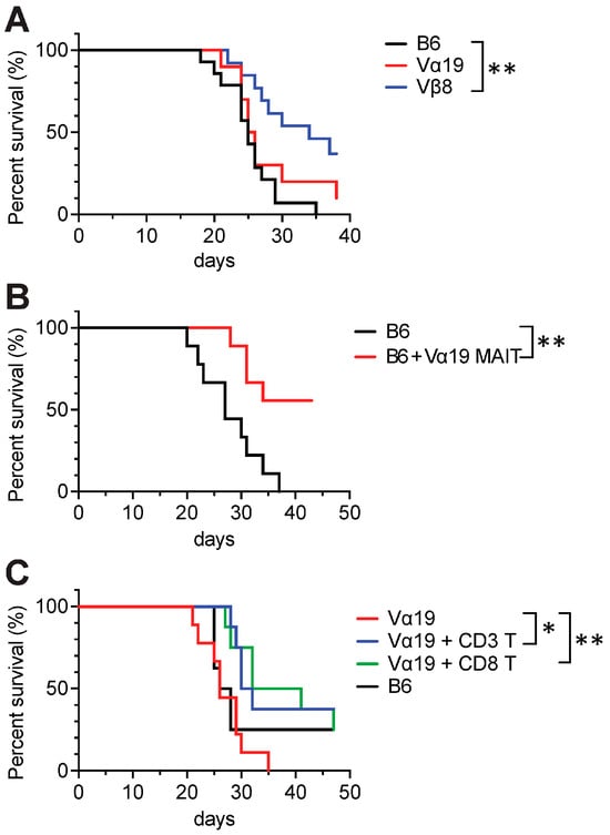 Our previous study demonstrated that MAIT-like cells prepared from iPSCs exert anti-tumor activity, increasing mouse survival upon adoptive transfer []. Therefore, whether the Vα19 and Vβ8 mice exhibited a similar tumor resistance was explored. Intravenous inoculation of Lewis lung carcinoma (LLC) into Vβ8 mice led to an increased mouse survival time relative to control mice, an effect not observed in Vα19 mice (Figure 6A). It is possible that MAIT cells in Vα19 mice were defective with respect to anti-tumor activity. Therefore, whether the adoptive transfer of MAIT cells from Vα19 mice into wild-type mice improved survival for the LLC-inoculated mice was examined, which it did. This indicated that the intrinsic anti-tumor activity of MAIT cells is preserved in Vα19 mice (Figure 6B). As the T cell repertoire of Vα19 mice was reduced at the cost of MAIT cell increase (Figure 4 and Table S1), whether supplementing with wild-type mouse T cells improved the survival of LLC-inoculated Vα19 mice was examined. Given that T cells, as represented by cytotoxic CD8+ T cells, are pivotal for antitumor activity, CD3+ T cells or CD8+ T cells were adoptively transferred into Vα19 mice. The survival curves upon LLC inoculation for control and Vα19 mice were similar; however, Vα19 mice with the adoptive transfer of CD3+ T cells or CD8+ T cells from the control mice experienced increased survival time (Figure 6C). These data indicate that other subsets of immune cells are required for MAIT cells to exert effective anti-tumor activity.