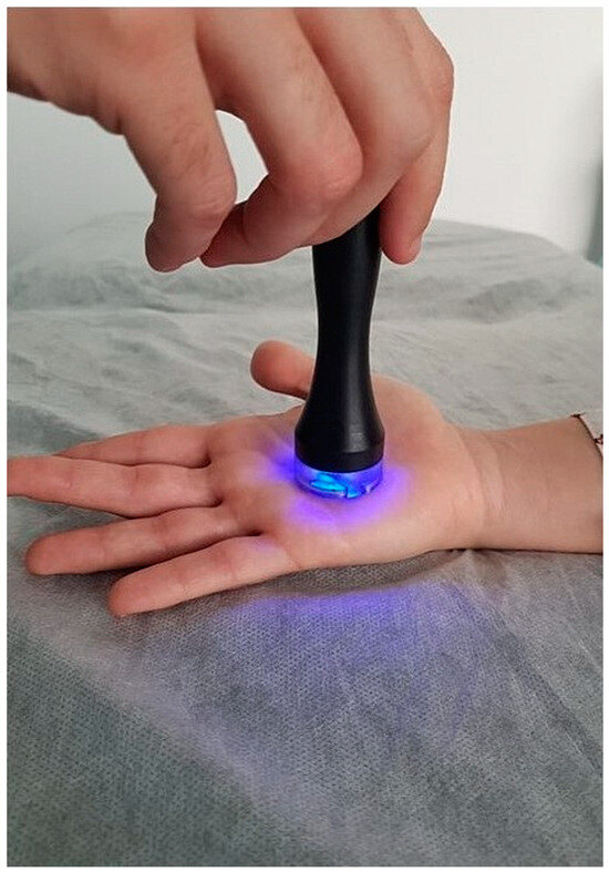 Devices that apply radiofrequency cause the cellular structures in its path to oscillate, thus resulting in increased intermolecular motion. As the current flows alternately, molecular collisions increase, thereby creating thermal energy (heat) [14]. In accordance with a previous study, a model Xcultp® (Biotronic Advance Develops S.L., Granada, Spain) was used to provide a monopolar dielectric capacitive radiofrequency with a wave frequency of 850 kHz, digitally modulated up to 160 Hz, and with a carrier wave amplitude of 8 Kv [20]. All subjects were placed in a seated position with the forearms supinated and resting on a stretcher, where the emission of radiofrequency was applied using a 5 cm2 circular head for a total of 10 min on the palm of each hand through an almond oil conductor. Figure 1 shows the application of PRF at the palmar centre of the hands.