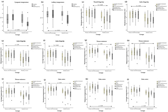 Box plots of core body temperature and peripheral temperature values at palm sites of the hands after radiofrequency treatment for the women with fibromyalgia and healthy controls. The box plots show the comparison of baseline and post-radiofrequency data from (a) tympanic temperature, (b) axillary temperature, (c) thumb fingertip maximum temperature, (d) index fingertip maximum temperature, (e) index fingertip minimum temperature, (f) index fingertip mean temperature, (g) thenar eminence maximum temperature, (h) thenar eminence minimum temperature, (i) thenar eminence mean temperature, (j) palm centre maximum temperature, (k) palm centre minimum temperature, and (l) palm centre mean temperature. In the box plots, the boundary of the box closest to 0 indicates the 25th percentile, the black line within the box marks the median, and the boundary of the box farthest from 0 indicates the 75th percentile. Whiskers above and below the box indicate the 10th and 90th percentiles. * Significant group, p < 0.05. Note that black dots indicate the extreme values.