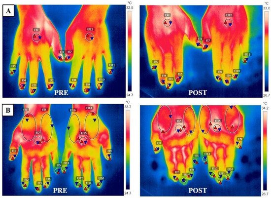The baseline pattern of the vascular component of the hands was analyzed using an infrared thermography (IRT). IRT provides indirect information on blood flow, circulation, thermal properties, and the thermoregulatory functionality of the skin tissue [17]. The process of how the thermographic evaluations were conducted on the dorsal surfaces and palms of both hands has been described in previous studies [18].