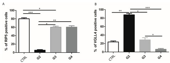 Ratio of RIP5- and VGLL4-positive cells in control kidney and mRCC. Graphic presentation of quantitative expression of RIP5 (A), and VGLL4 (B) in control (CTRL) and different grades of mRCC (G2–G4). Data are presented as mean ± SD. * p ˂ 0.01, ** p ˂ 0.001, *** p ˂ 0.0001, Kruskal–Wallis followed by Dunn’s multiple comparison test.