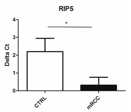 Ct value of RIP5 in control kidney and mRCC. qPCR was performed to determine the mRNA levels of RIP5 in metastatic renal cell carcinoma and control tissues. Higher Ct value indicated lower gene expression. * p ˂ 0.05.