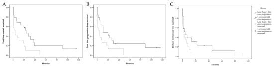 Graphical presentation of survival in mRCC patient. First-line overall survival stratified by RIP5 fold gene expression (A); first-line progression-free survival stratified by RIP5 fold gene expression (B); distant metastasis free survival stratified by RIP5 fold gene expression (C).