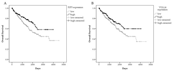 Graphical presentation of survival in ccRCC patient in GDC TCGA KIRC. Overall survival by gene expression RNAseq-HTSeq-FPKM-UQ for patients with high and low RIP5 expression (A), and high and low VGLL4 expression (B). Data used from the GDC TCGA KIRC.