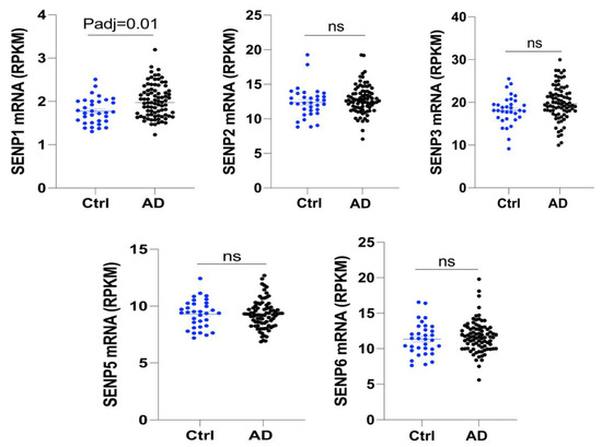 The mRNA levels of SENPs in the fusiform gyrus tissue of AD and normal age-matched controls. SENP1 mRNA levels were upregulated compared to age-matched controls, while the mRNA levels of other SENPs, including SENP2, SENP3, SENP5, and SENP6, remained unchanged in AD patients. Data represent mean ± SEM (normal control = 33, AD patients = 84). ns, no significance. Abbreviations: AD, Alzheimer’s disease; SENPs, SUMO/sentrin-specific proteases.