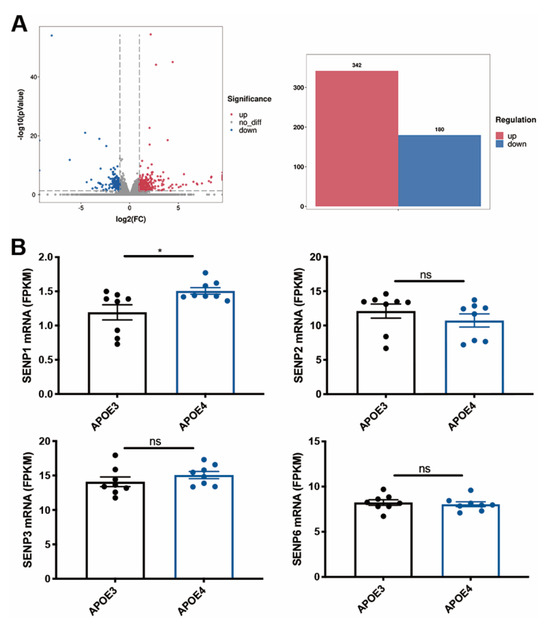 The mRNA levels of SENPs in aged APOE4 mice compared with age-matched APOE3 mice. (A) Volcano plot of DEGs in the hippocampus tissue of 16-month-old APOE4 mice compared with age-matched APOE3 mice, with a histogram showing 342 upregulated DEGs and 180 downregulated DEGs. (B) SENP1 mRNA levels were upregulated, while the mRNA levels of SENP2, SENP3, and SENP6 remained unchanged in 16-month-old APOE4 mice compared with age-matched APOE3 mice. Data represent mean ± SEM (n = 8). * p < 0.05. Student’s t test was used to determine the statistical significance of the differences. ns, no significance. Abbreviations: DEGs, differentially expressed genes.