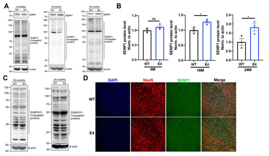 SENP1 and SUMOylation alterations in the cortical tissue between aged APOE3 and APOE4 mice. (A) Levels of SENP1 and SUMO1-conjugated proteins in the cortical tissue of 8-, 16-, and 24-month-old APOE3 and APOE4 mice. (B) Relative expression levels of SENP1 qualified and analyzed using ImageJ bundled with Java 8 (n = 3). (C) SUMO2/3-conjugated protein levels in the cortical tissue of 16-month-old and 24-month-old APOE3 and APOE4 mice. (D) The cortical sections of 24-month-old APOE3 and APOE4 mice stained for SENP1 (green staining) and NeuN as the neuron marker (red staining). Nuclei were stained with DAPI. Bar: 100 μm. The data are presented as the mean values ± SEMs, and significance was calculated with Student’s t test. * p < 0.05 versus the control group. ns, no significance.