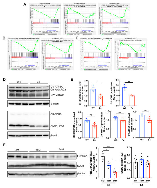 Deficits in mitochondrial function are well-known hallmarks of brain aging, prominently accentuated in neurodegenerative disorders [22]. GSEA showed that the genes enriched in oxidative respiratory chain (Figure 6A), oxidative phosphorylation (OXPHOS) (Figure 6B), mitochondrial translation, and morphogenesis (Figure 6C) were downregulated in aged APOE4 mice compared with age-matched APOE3 mice. The protein expressions of the OXPHOS system, consisting of five multi-subunit complexes (CI–CV), were decreased in the cortex of aged APOE4 mice compared with age-matched APOE3 mice (Figure 6D,E). The oxidative damage caused by mitochondria-derived reactive oxygen species is believed to be a major cause of degenerative diseases associated with aging [23]. Therefore, we further detected the oxidative stress protein superoxide dismutase 2 (SOD2) and forkhead-box protein O3a (FOXO3A) in the cortex of aged APOE4 mice. As shown in Figure 6F, FOXO3A was considerably repressed with the aging of APOE4 mice, and the SOD2 protein showed a declining trend in 24-month-old APOE4 mice.