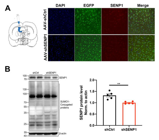 SENP1 knock-down in the brains of aged APOE4 mice. (A) Representative immunofluorescence images of SENP1 expression in APOE4 mouse cortical neurons (EGFP) infected by AAV loading SENP1 shRNA or Control shRNA (scale bar = 50 µm). (B) Efficiency of SENP1 silence by AAV and changes in SUMO1-conjugated protein levels were analyzed by WB (n = 5). Statistical results showing the normalized protein levels. The data are presented as the mean values ± SEMs, and significance was calculated with Student’s t test. ** p < 0.01.