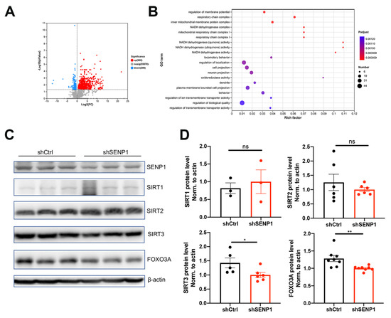 APOE4 significantly impacts mitochondrial function and mitophagy, leading to alterations in oxidative stress, synapses, and cognitive function [6,24]. Furthermore, SENP1 and target deSUMOylated proteins exert their effects on mitochondrial metabolism and functions [11,25]. Thus, we speculated that SENP1 might play a role in mitochondrial metabolism and function in aged APOE4 mice. To investigate the possible role of SENP1 in aged APOE4 mice, we selectively eliminated SENP1 in the brains of aged APOE4 mice using AAV, confirming the precise deletion in neurons through immunofluorescence staining and Western blotting (Figure 7A,B). Low-molecular-weight SUMO1 conjugation showed an increasing trend by SENP1 knock-down in aged APOE4 mice. Transcriptome analysis of the cortex in aged APOE4 mice revealed 902 upregulated and 200 downregulated DEGs in APOE4 mice infected with shSENP1 compared to the control group (Figure 8A). Intriguingly, the GO enrichment analysis indicated that enriched biological processes (BPs) of downregulated DEGs were mainly centered on mitochondrial energy metabolism (Figure 8B), and BPs of upregulated DEGs were mainly centered on immune response and inflammatory process.