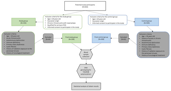 The research was conducted from December 2017 until May 2023 and included 544 individuals. The study group consisted of 106 patients with CRSwNP and the control group was formed by 438 volunteers. All participants signed a voluntary, informed consent to the laryngological examination, blood sample collection, and further genetic tests. The study was approved by the Bioethics Committee of the Medical University of Lodz (RNN/05/18/KE).